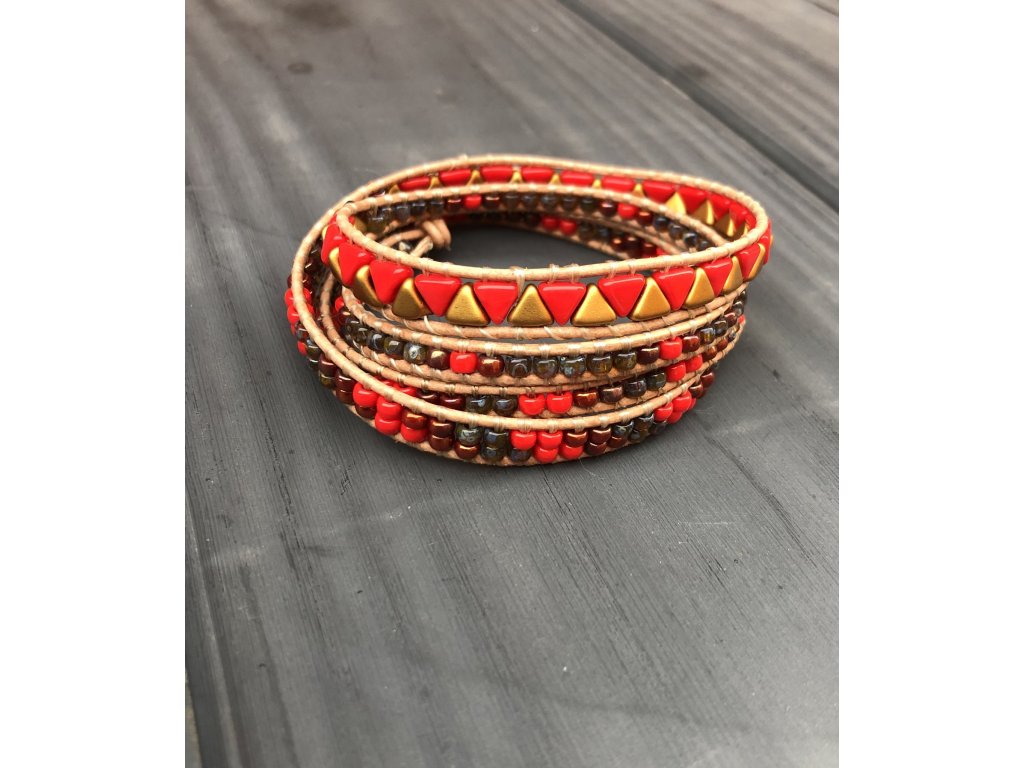 Ručně šitý náramek ze světle hnědé kůže a českých a japonských korálků