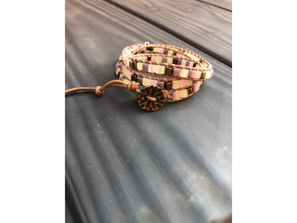 - Náramek je šitý časově náročnou technikou wrapping, kdy se jednotlivé korálky našívají ke kožené šňůrce pevnou nymo nití